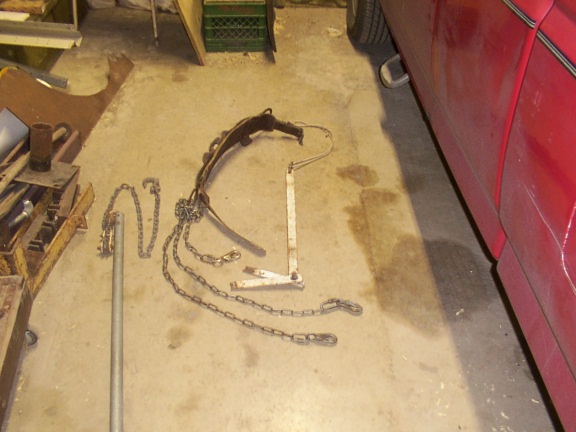 The little pulley at the top of the gin pole doesn't have to be anything very special, but I'd recommend against using cheap steel stamped or tack-welded pulleys. The one I have is an idler pulley off of a Ride King lawnmower, about 2" in diameter (avoid smaller pulleys) with a bearing in the middle ready to accept a 5/16" bolt. To each side of the pulley I have some 3/16" thick flat steel bar, with another bolt at the top. A 5/16" hook is hung into the top of the gin pole, a couple of links of chain run from that to the top bolt in the pulley assembly, and a few more links are run back up and fed into the top of the pole, where a bolt through the pipe holds the chain in.