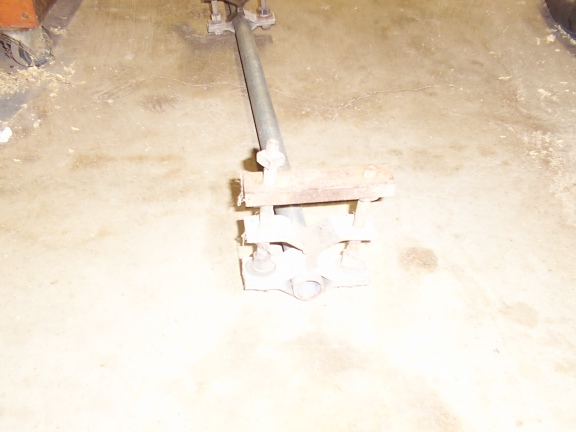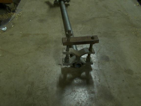 The second tool is popularly called a gin pole. This is the device (basically a pipe) which clamps onto an installed tower section and allows you to install one above it (or remove the one above it). It consists of a pipe about as long as one tower section, 2 "clamps", and a pulley. About the only thing special about the pole is, surprisingly, not the pulley, but rather the clamps. The pipe itself can be a nice aluminium pipe, or, as I use, a regular piece of galvanized 1 1/4" water pipe.
