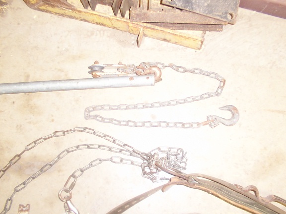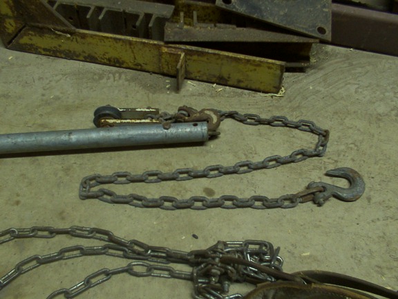 The little pulley at the top of the gin pole doesn't have to be anything very special, but I'd recommend against using cheap steel stamped or tack-welded pulleys. The one I have is an idler pulley off of a Ride King lawnmower, about 2" in diameter (avoid smaller pulleys) with a bearing in the middle ready to accept a 5/16" bolt. To each side of the pulley I have some 3/16" thick flat steel bar, with another bolt at the top. A 5/16" hook is hung into the top of the gin pole, a couple of links of chain run from that to the top bolt in the pulley assembly, and a few more links are run back up and fed into the top of the pole, where a bolt through the pipe holds the chain in.