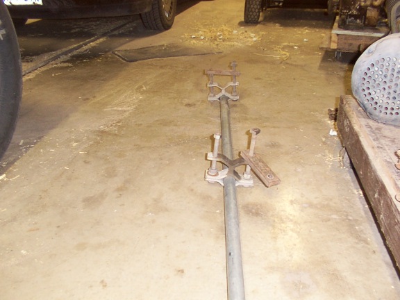 The second tool is popularly called a gin pole. This is the device (basically a pipe) which clamps onto an installed tower section and allows you to install one above it (or remove the one above it). It consists of a pipe about as long as one tower section, 2 "clamps", and a pulley. About the only thing special about the pole is, surprisingly, not the pulley, but rather the clamps. The pipe itself can be a nice aluminium pipe, or, as I use, a regular piece of galvanized 1 1/4" water pipe.